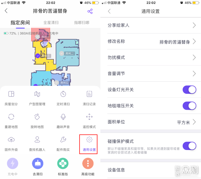 通用设置功能:通用设置里东西大多保持默认就好了。勿扰模式作用不大,只能让机器不说话,手机 App还是会叮叮叮的发送通知消息;地毯增压开关建议开着,防止T90卡在地毯边缘。碰撞保护模式也建议开着,别让T90把您几十万买的红木家具碰掉漆了...哈哈。