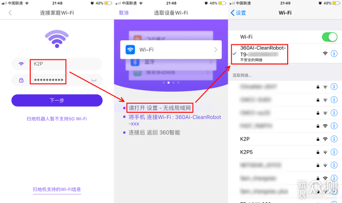 下一步是在App提示下输入家中的2.4G WiFi名称(SSID)和密码,T90不支持5G WiFi哦。重置WiFi操作会让T90公开一个360AI-CleanRobot-T9-xxx的WiFi连接。此时把手机的WiFi连到T90公开的那个SSID上去,App就是把刚才排骨输入的2.4G SSID/密码 发送给T90。(360摄像头之类的设备是通过http://admin.zhongce.sina.com.cn/article/edit/26236的特殊音频信号发送的)