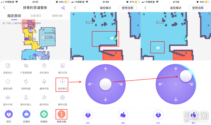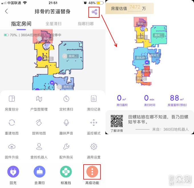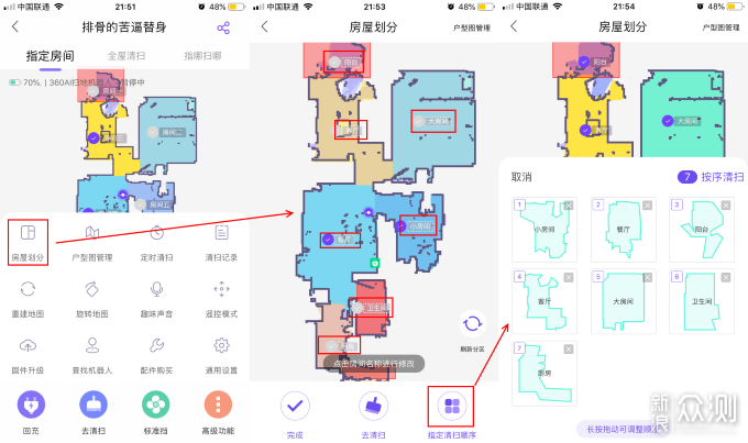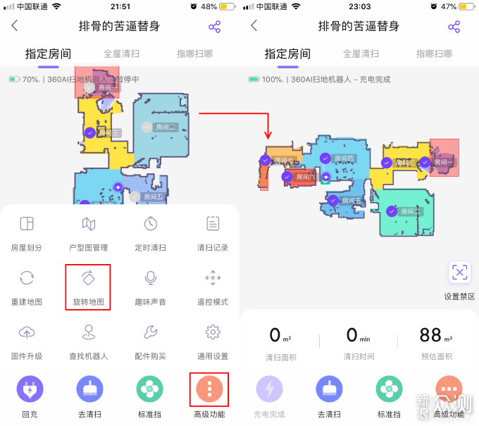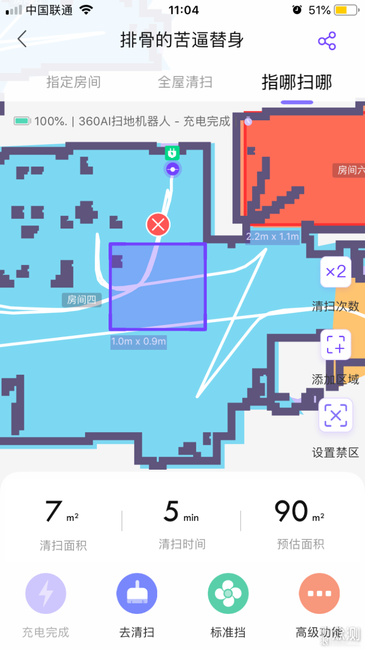 在T90扫描过房间还没正式开始清扫时,可以在App上设置好禁区,避免T90被惨兮兮的卡在某些角落喊着"主人救救我!"... 3.高级功能的使用等首次全屋清扫完成,T90自动回充后,360智能的App才会解锁某些高级功能。高级功能的菜单显示在App右下方。 房屋划分功能:不让排骨指定每个房间的区域,排骨只能修改360生成的房间名称,当然还可以指定所有房间的清扫顺序。排骨推荐顺序:卧室 -> 客厅 -> 餐厅 -> 厨房 -> 卫生间。
