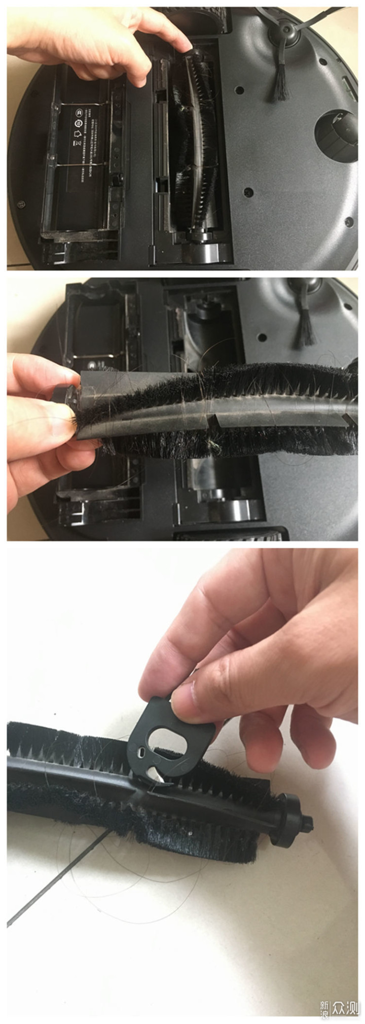 除了尘盒外,T90的主刷也是需要经常清理的部件。长发细线是主刷清理的主要对象,它们会缠绕在主刷上很多圈,积多了会影响主刷和刷毛的正常工作。T90随机附送的小工具是清理主刷的利器,用其刀口将主刷的缠绕物割断,再用手指拨掉缠绕物就轻松完成主刷的清理工作了。