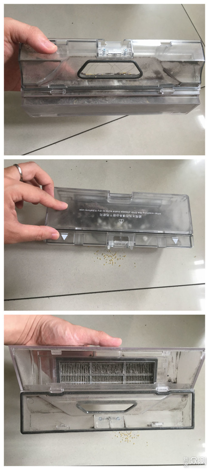 2.每次清扫完都要清理千万不要低估了城市里的浮尘和你的掉发速度...特别像上海这样比较潮湿的城市里,一天不清理尘盒,里面会滋生大量的细菌霉菌子孙菌众测菌.... 翻开上盖,两指轻轻一捏尘盒就取出来了。