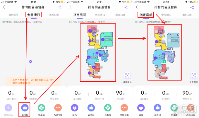 苦逼的替身准备就绪,排骨摆脱主要家务的第一步已经万出了! 2.首次清扫,务必完成。点开刚刚绑定的T90,三种清扫方案(指定房间/全屋清扫/指哪扫哪)只能选全屋。需要全屋清扫一次,让T90的LDS激光传感器把排骨家的各房间的开放地面空间数据收集并上传到360服务器,生成对应的实际户型图后,通过360云端根据每个空间的开放面积和瓶颈位置计算出房间范围和数量。待各房间数据收集整理好后,就可以使用"指定房间"方案选择只打扫某些房间了。