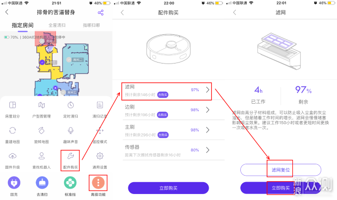 配件购买功能:每个App都要氪金系列...T90会按清扫累积时间估算配件的寿命,其中滤网/边刷/主刷三样属于耗材,用户可以根据T90估算结果或者自己感觉来决定是否更换。传感器部分自己拿布擦擦就好,没什么明显的摔摔碰碰一般不会坏。