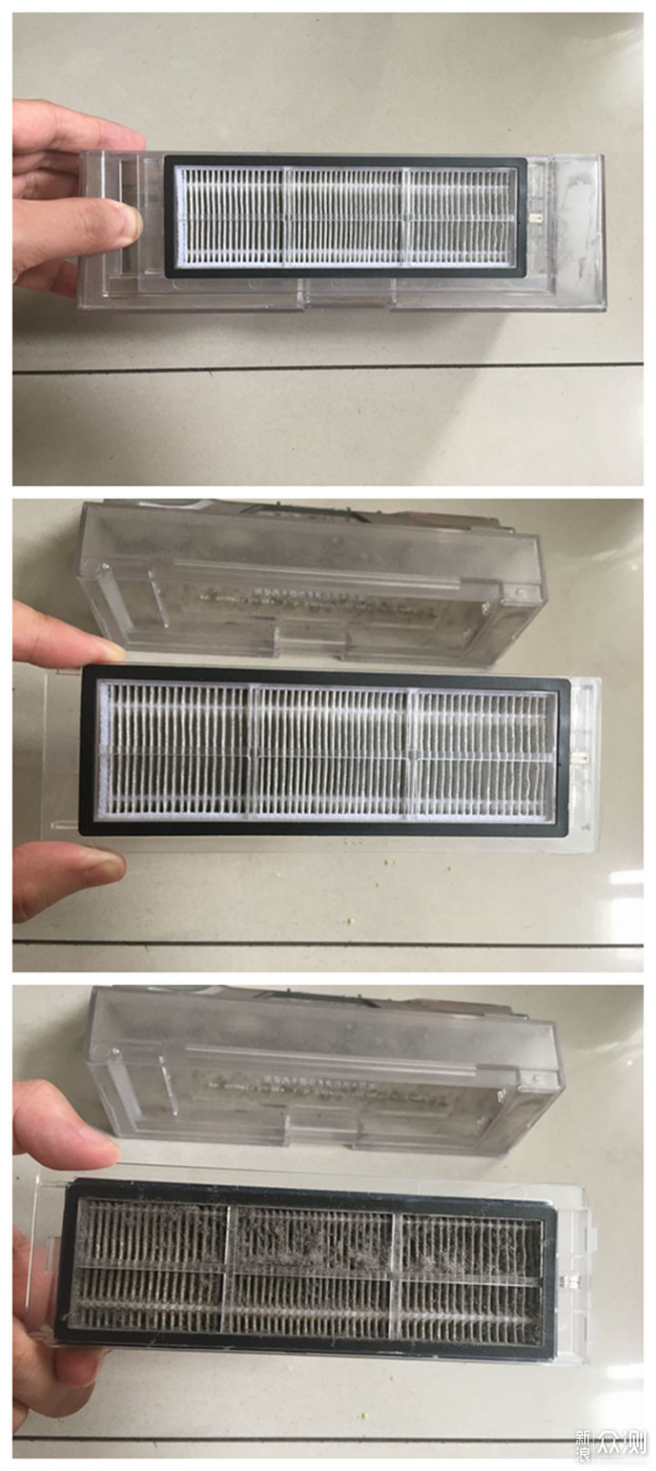 倒出尘盒里的垃圾后就可以水洗尘盒了。尘盒上的滤网是可以取出来的单独清洗的,灰尘污物都积在内侧,要取出来才方便清洗。