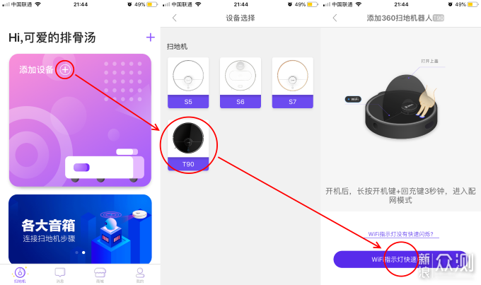 二.使用360智能App控制作为一款"智能"电子产品,移动设备App才是T90扫地机器人的主要操控方式. 360智能下载地址: [url=]http://smart.360.cn/cleanrobot/app.html[/url] 1.初始联机操作,绑定T90安装好360智能的App后,第一件就是登录(注册)360账号,然后与T90扫地机器人联机。首先按下图添加T90设备。