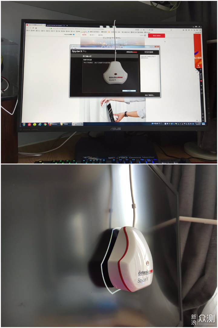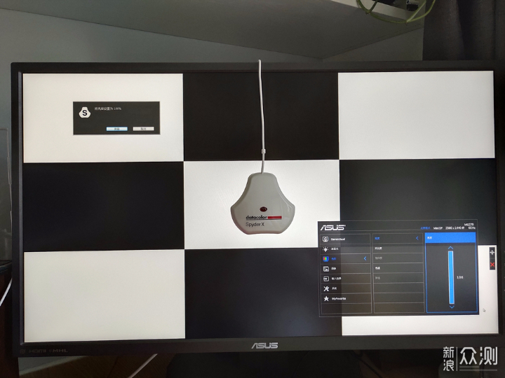 在进入软件后,可以看到系统会一步步对测试过程进行提示,比如屏幕上出现一个框框,提示把SpyderX蓝蜘蛛对准放好,使用起来很人性化。