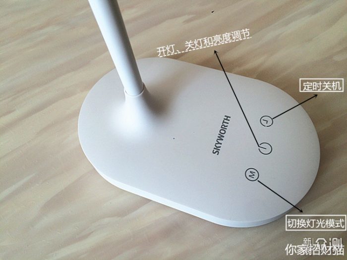 台灯底座是醒目的的创维LOGO,可见出身名门。下面是三个重要的按键:切换灯光模式、开/关灯、亮度调节和定时关机。三个按键均属电容式触摸控制,非常的灵敏易操作。灯光切换模式支持3种灯光光效切换,每次触摸都会改变一种灯光模式,灯光模式由自然灯—白光—暖白光循环变换。 定时关机模式可以在任意灯光模式状态下,长按该图标启动“定时关机”功能,此时台灯将会闪烁2下,提示定时功能已经开启,定时时间40分钟即可自行关闭。