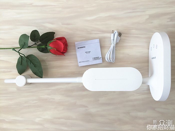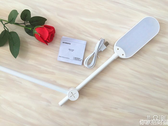创维悦目LED台灯的台灯主体、短小精悍的USB充电线、印刷精致详细的产品说明书组成。创维悦目LED台灯是采用小巧可爱的两段式结构设计,整体而言非常的小巧轻盈。灯架部分有30厘米,灯臂有25厘米,大小适中的尺寸+洁白的色调可以轻松的融入到现在家居装修的各种风格中,与我们的品质生活融为一体。