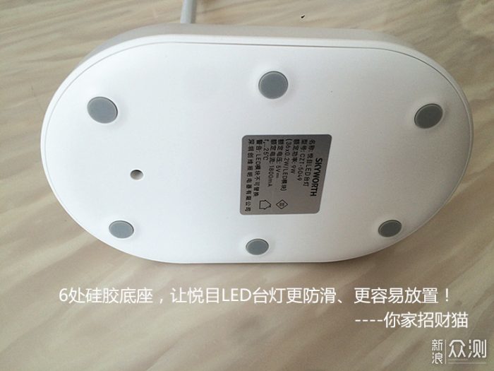 底座下面为了让台灯更加稳固的放置,特别设计了6处硅胶底垫,整个台灯底座采用一体式设计,没有螺丝外露,在提高防水效果的同时最大限度的降低了儿童触电的可能性。