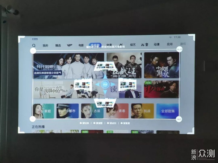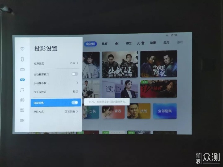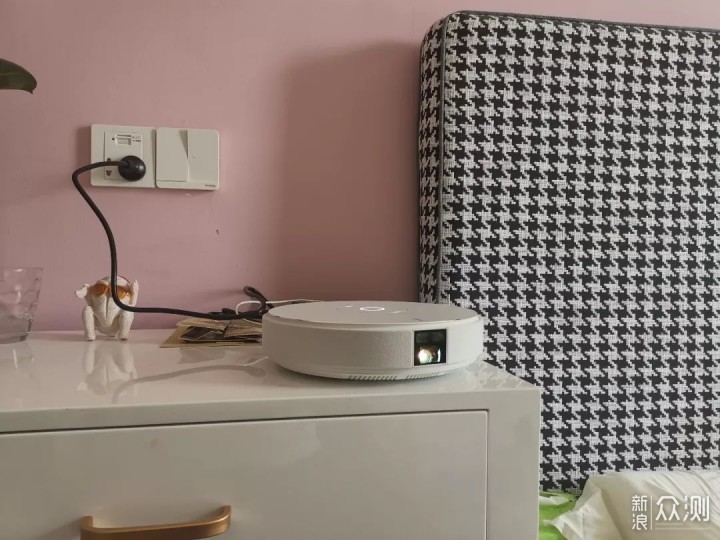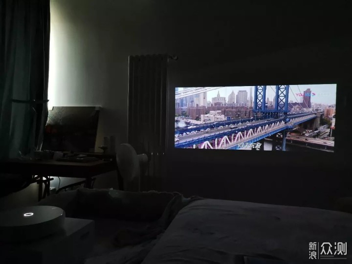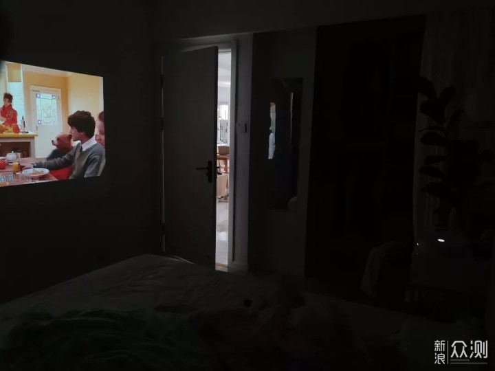 作为一款便携式投影其实很少有机会能正投,常见的应用场景基本都是侧投,所以这个梯形矫正就十分有用了。大家可以看到当这款投影放在床头柜侧投时,完全可以通过梯形矫正来实现画面的方正。