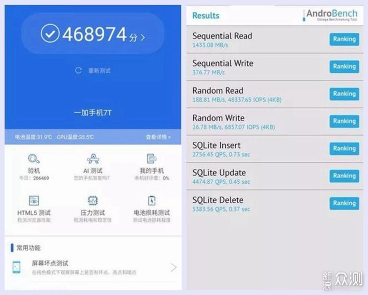 在跑分环节,一加7T安兔兔跑分为468974分,其中CPU得分144078分,GPU得分185620分,稳稳的站在了第一梯队;此外,AndroBench测试的读写性能也取得了非常出色的成绩。