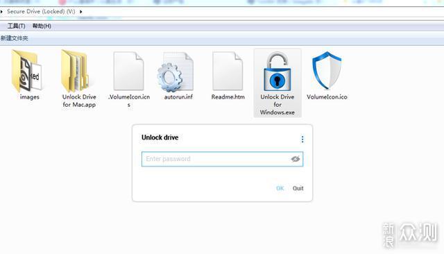 密码设置成功后就并不需要Toolkit软件了。此时我们看不到移动硬盘的正常容量,打开硬盘只能看到几个无关紧要的系统文件,所有存储的文件均被隐藏起来。只有在运行"Unlock Drive for Windows.exe"时会提示这是有锁设备,需要输入正确密码才可使用。