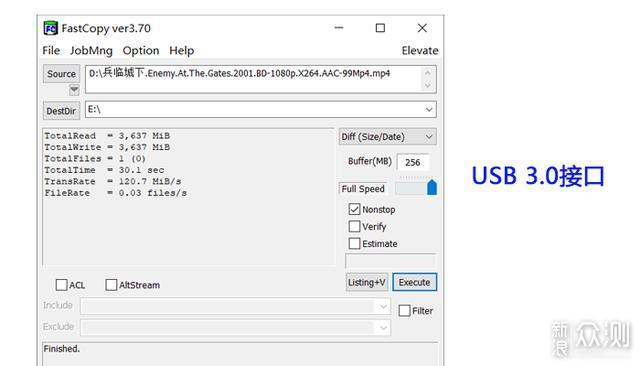 在ATTO中的测试结果: ◆【USB 3.0模式】最低写入速度约118 MB/s,最大读取速度约102 MB/s。 ◆【转Type-C接口模式】最低写入速度约121 MB/s,最大读取速度约135 MB/s。 ----------- ■FastCopy测试 测试选择约3.8GB的视频文件进行简单测试。