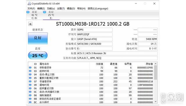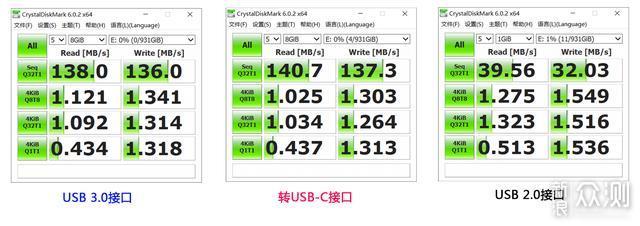 首先借助CrystalDisklnfo软件对希捷Ultra Touch移动硬盘的基本参数进行确认。空间1000 GB(1T),转速5400 RPM,SATA/300传输模式。 ----------- ■Crystal diskmark 为了尽量更全面的测试,在Crystal diskmark中分别对USB 3.0、Type-C和几乎淘汰的USB 2.0接口分别进行测试。