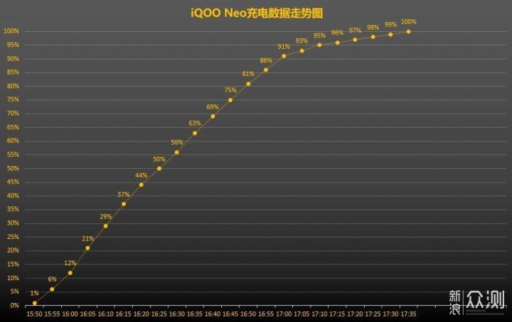 在相同环境下,依然每5分钟记录一次电量,iQOO Neo从1%到100%满共耗时约105分钟,22.5W与33W的快充差距还是比较明显的。