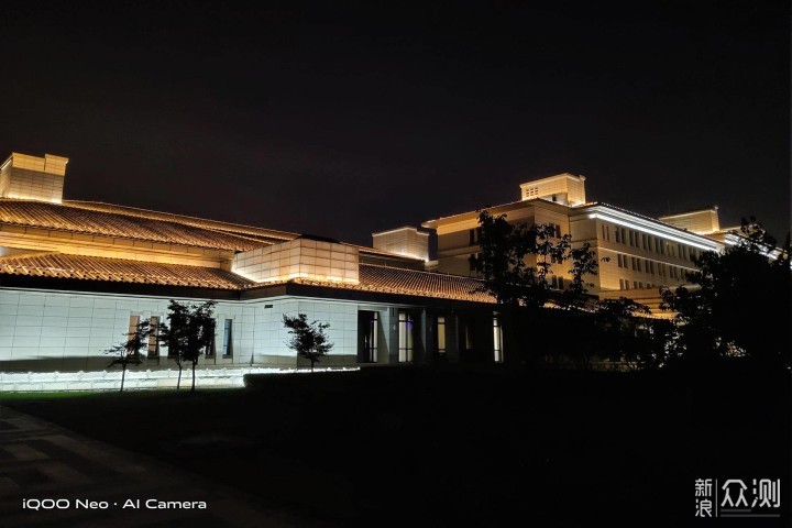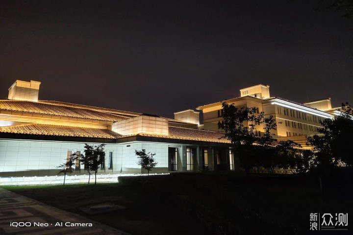 iQOO Neo 855版支持超级夜景模式,基于夜景算法和高通骁龙855的HVX处理能力,可以将12到最多16张照片多帧降噪,合成一张成品照片。从下图中的地面、花草树木和远处的楼房可以看出,和自动拍照相比,夜景模式下的照片整体亮度高过自动模式,暗部细节及层次感也更加丰富。虽然超级夜景模式提升了画面亮度,但噪点变得非常明显。