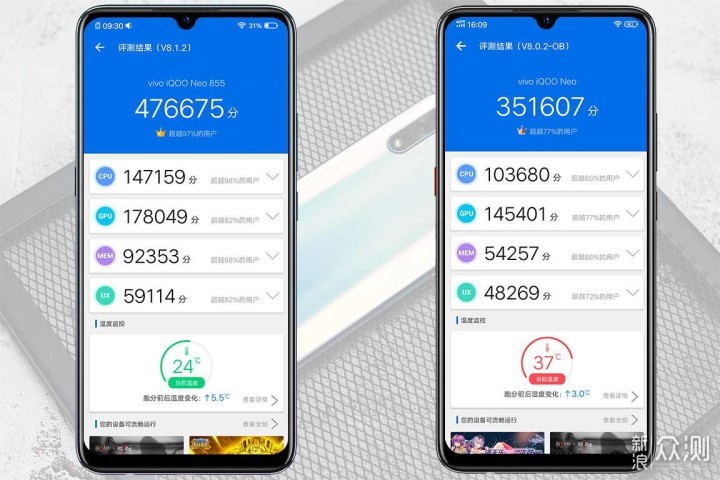 在安兔兔测试中,iQOO Neo 855版的整机测试超过47.6万分,而iQOO Neo的整机跑分为35W分,两者之间的差距主要还是处理器和存储两个部分。作为2019年上半年旗舰处理器,高通骁龙855处理器采用了全新7nm制程工艺的Kryo 485 CPU核心,GPU为Adreno 640;而高通骁龙845处理器基于三星的10nm工艺的Kryo 385 CPU,GPU则为Adreno 630。