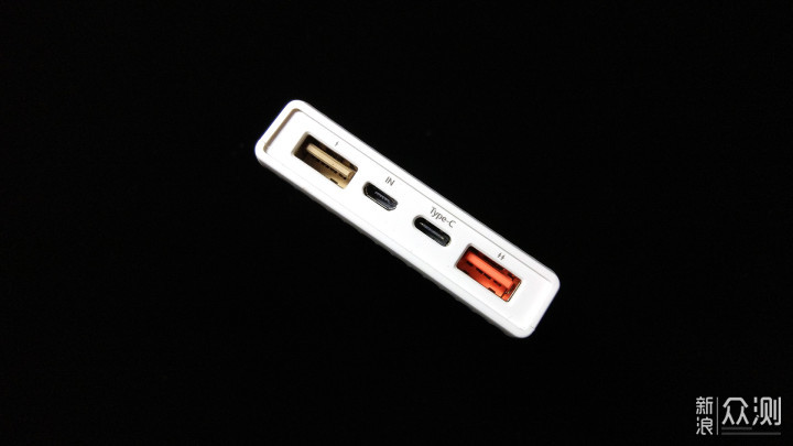 而顶部则是所有的插口集中区,上面有USB-A*2、Type-C和microUSB接口,其中Type-C接口为双向接口,支持电流的输入与输出。