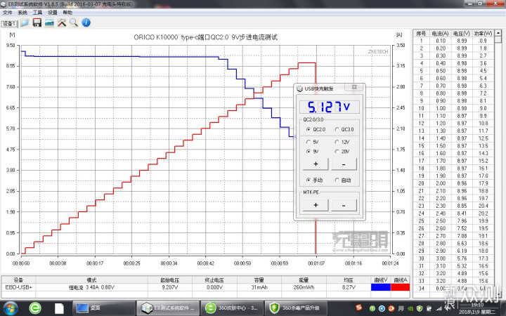 9V最大输出功率为20.5W,超出标称的18w数值,最大电流为2.74A,取有效电压区间的最大电流为2.3A,电压较为稳定,过程有微弱的线补。
