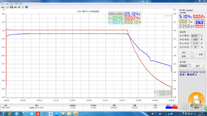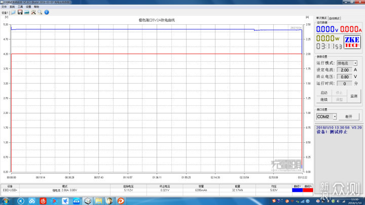 对白色端口进行5V2A放电可得如下曲线,可见曲线非常平直,均压为5.05V,释放能量为32.48wh转化率为87.78,耗时三小时十三分,转化效果一般。