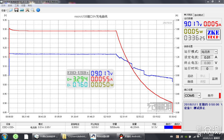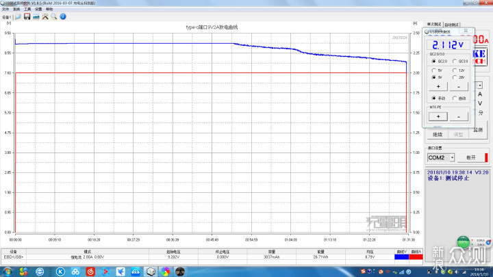 鉴于时间原因,所以对Type-C端口仅测试了QC2.0协议下9V2A的放电情况,结果为下图曲线,通过下图可见产品前半期可以维持正常的9V2A状态放电,但是释放一半电量左右,电压基本就开始下降了,大概在三分之二时间的时候电压进入了非正常区域,所以这里的数值也仅供参考,端口释放的能量为26.71wh,均压为8.79v,转化率为72.19%,耗时一小时三十一分,转化率不理想。