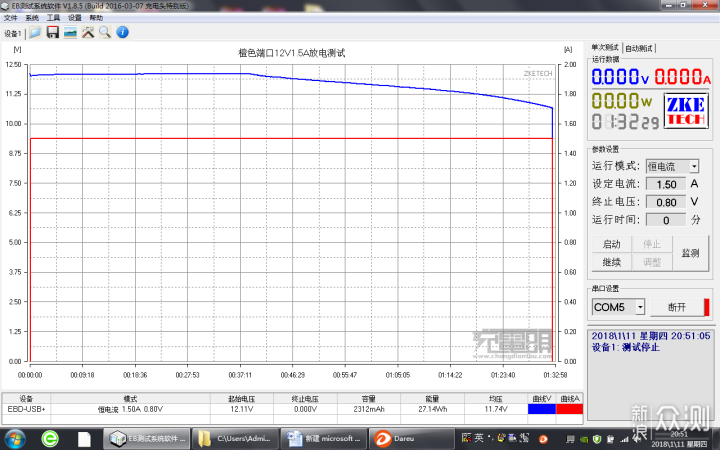 而12V1.5A放电曲线则不太理想,放电到五分之二的时候电压开始下降,正常情况下大概放电在一半的时候电压基本就处于非正常的状态,所以此结果仅供参考,总过程释放能量为27.14wh,转化率为73.35%,均压11.74v,耗时一小时三十三分,结果不理想。