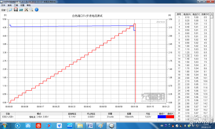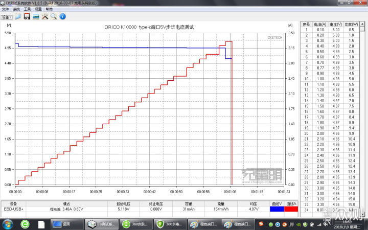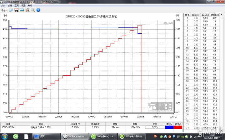 因为白色端口支持的协议非常的少,所以仅进行普通的5V步进电流测试,实验结果如下图所示,输出功率最大达到16.2w,最大电流达到3.3A,和产品标称一样,曲线较为稳定,有线补。