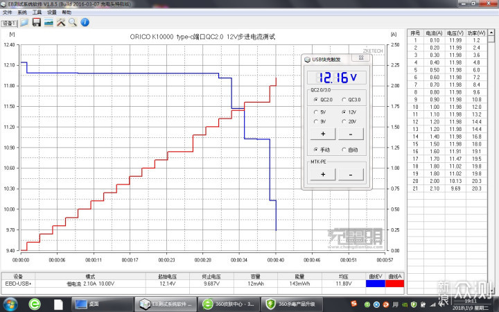 对Type-C接口进行简单的5V、9V、12V步进电流测试(同上面相同,测试均以QC2.0协议为主),5V的时候最大输出功率为15.8w,取有效区域的最大电流为3.2A,与产品的标称差不多,期间电压较为稳定,不过没有线补。