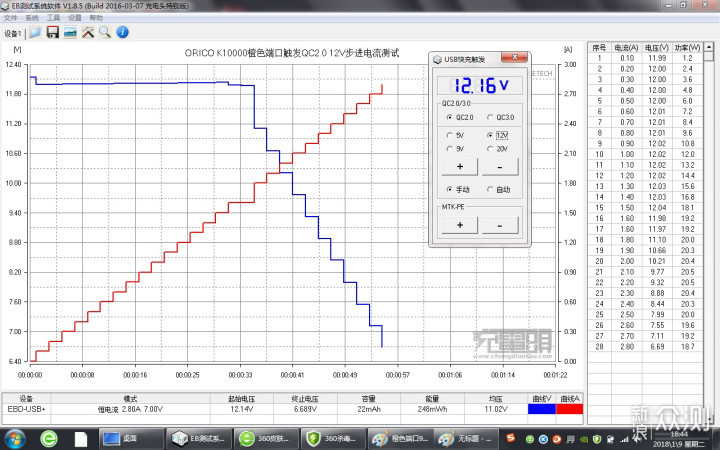 为了验证产品性能,于是对USB-A橙色端口进行了简单的5V、9V和12V步进电流测试(测试均以QC2.0协议为主,原谅我偷懒了),可见5V最大功率输出为16.1w,最大电流为3.3A,电压较稳定,有微弱的线补,与产品描述基本符合。