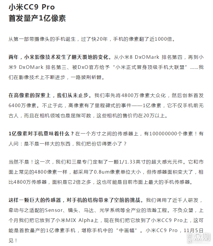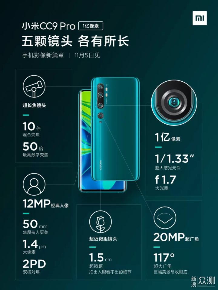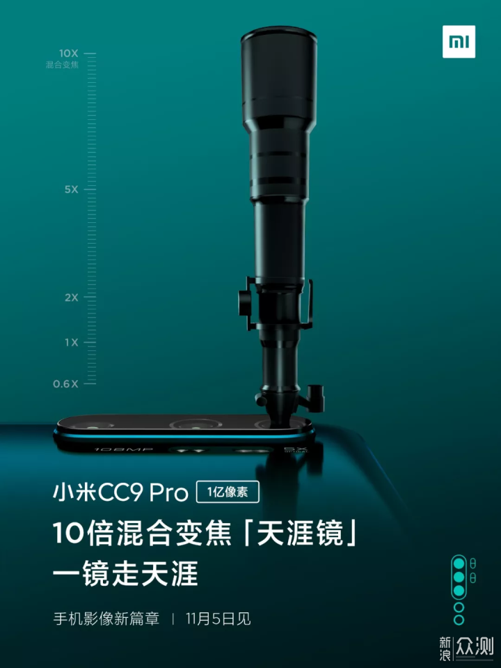 从工信部的信息可以看出,屏幕方面,小米CC9 Pro将会配备一块6. 47英寸OLED显示屏,分辨率2340×1080。据传言,小米CC9 Pro手机将会使用一块双曲面屏幕,顶部存在一颗“水滴屏”。 芯片方面,小米CC9 Pro手机将会搭载一颗主频为2.2GHz的处理器(骁龙730?730G?),搭配6/8/12GB内存+64/128/256GB闪存,运行Android 9系统,后置一亿像素五摄,还有一颗3200万像素的副摄,支持5倍光学变焦,支持屏幕指纹识别和快充,而且还支持红外线连接。 官方公众号还对即将发布的小米CC9 Pro的一亿摄像头进行了技术科普。 让我们看一看这颗摄像头有多牛。 看起来好高端的样子!