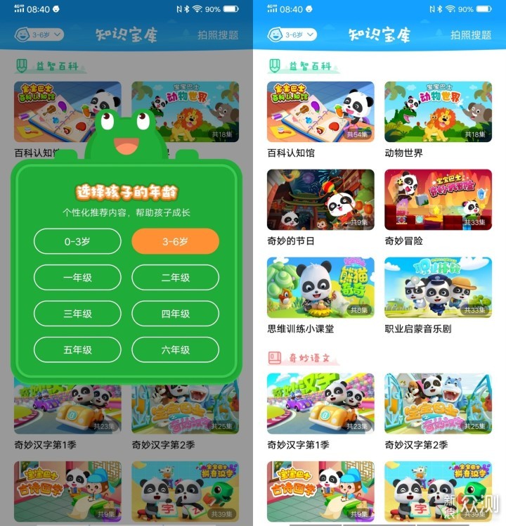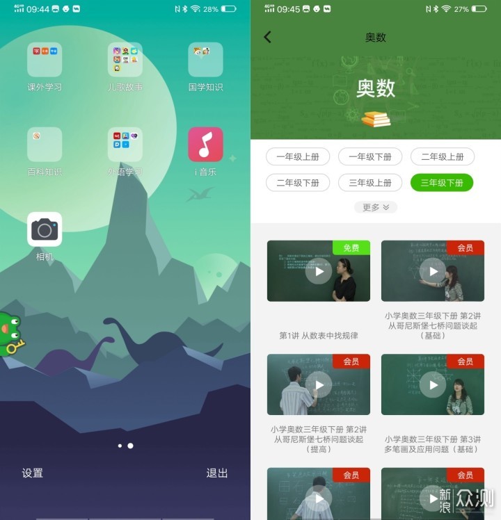 0~6岁的内容绝大部分都是免费观看,面向一年级~六年级的内容有收费的部分,类似于网上课程,对应教材的部分有人教版、北师大版、苏教版、人教版等不同的版本可供选择。另外儿童模式下的应用比较少一些,可用的就是音乐和相机部分,没有内置应用市场,不用担心自行下载应用的问题。