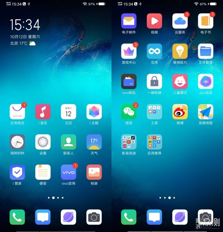 首先是扁平化设计的UI界面谈不上眼前一亮的感觉,但给人感觉就是简约,视觉观感上比较舒适,同时每个应用图标很大,同时图标之间的间距很大,少了密集感以及空间焦虑感。在系统内置的应用上,第三方数量有些多,比如新浪微博、微信、腾讯视频、优酷视频、爱奇艺视频、抖音、QQ浏览器、今日头条、喜马拉雅、美团、58同城、淘宝、京东等等社交、影视音乐、常用工具、资讯娱乐、生活类的应用。