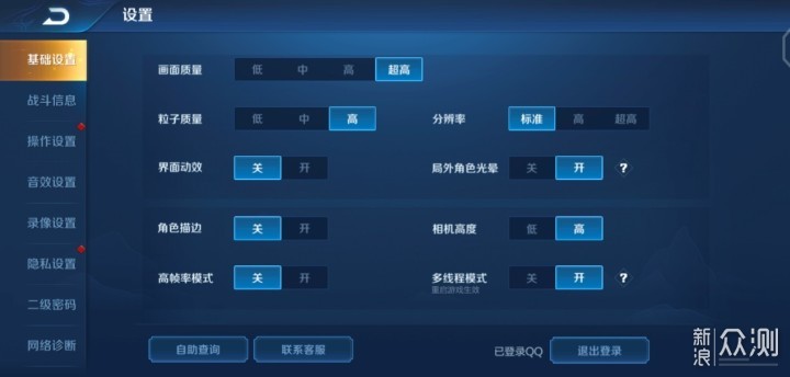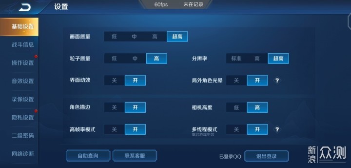 先说游戏性能上的实际表现,这是《王者荣耀》的默认参数设置,分辨率标准,界面动效、角色描边、高帧率模式均为开启,默认是锁30FPS。