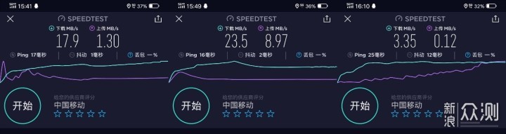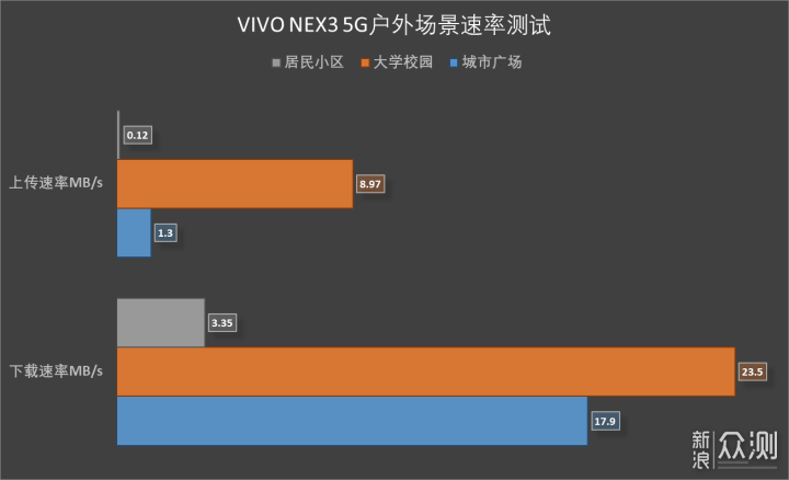 但我们不可能为了上个网还专门跑到5G营业厅中,而实际网络下的表现基本达不到营业厅环境下的速度,下图分别是城市广场、大学校园和居民楼三个不同地点的网速情况,测试的地点均为覆盖区的中央位置,可以看到最后一组的5G测试数据严重偏低,也就意味着即使能连接5G使用,也不代表你能体验到5G的高速性能,部分场景下的5G性能表现还不及4G。