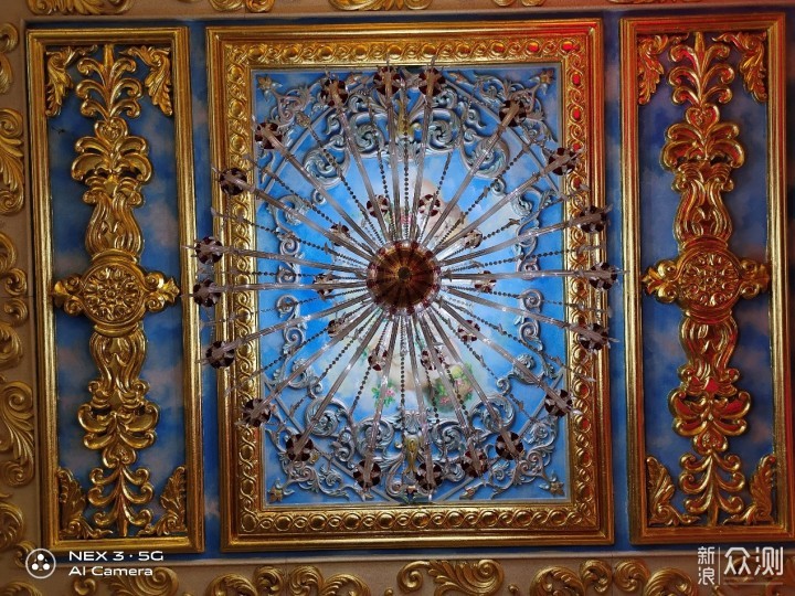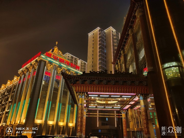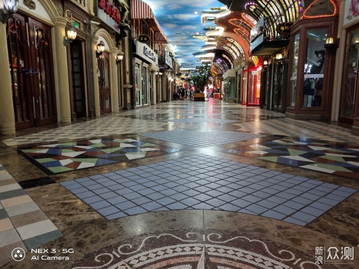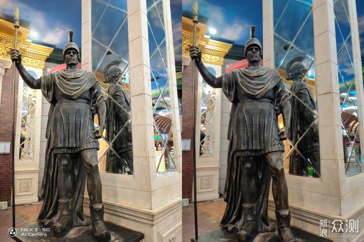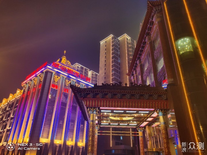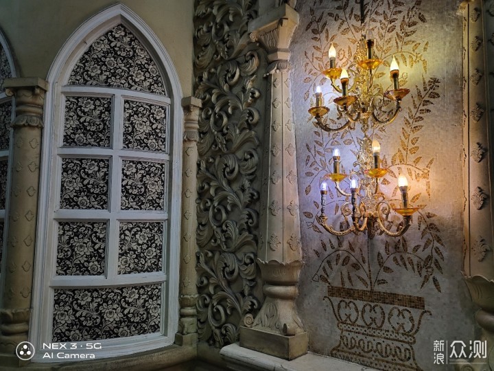 在用两张图来对比说说vivo NEX 3 5G版的夜景模式。图一是默认的拍照模式,图二是切换的夜景模式。对比可以看到,夜景模式下的整体亮度要更高,但同样对光源的部分进行很好的控制,没有出现严重的炫光问题。最重要一点是夜景模式下的细节展现上要更多,阁楼顶部雕刻清晰度上有提升,辨识度要高一些,右侧透明电梯通道也由全黑变为隐约可见。