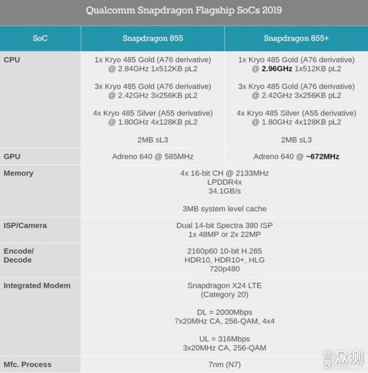 骁龙855和骁龙855+采用的都是同一架构Kyro485,同为7nm制程工艺,GPU均为Adreno640,但在CPU主频和GPU频率有所不同,骁龙855Plus比855有了提升,为2.96GHz。但两者的频率也是有所不同,855+的频率为672MHz,而855的只有585MHz,855+比855的图形能力提升了也是15%。两款都是采用的1+3+4的八核设计,除去大核频率不同,其余的7个小核频率没有改变。所以从理论上来说,骁龙855+有着更强的单核能力。与相比,骁龙855Plus相比于骁龙855,CPU主频从骁龙855的2.84GHz提升至了2.96GHz,GPU频率从骁龙855的585MHz提升到了675MHz。
