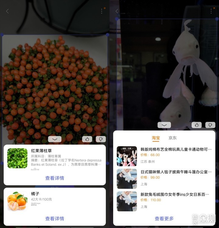 相比于翻译、搜题、文本扫描这些识别率和成功率很高的功能,识物这个功能的准确率要相对低一些,左侧识别的结果有两个,上面的红果博柱草是正确的结果,但是下面出来的橘子是毫不相干的。而右侧的这几条金鱼则是被识别为了玩具、衣物,在识别性能上还有很大的提升空间。