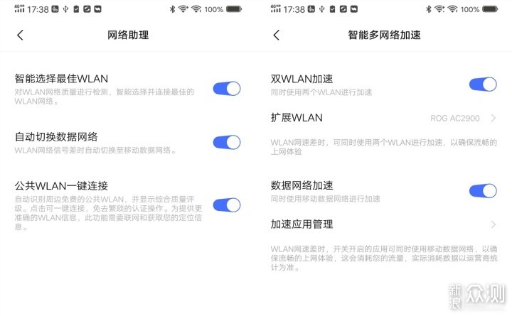 第三个就是网络加速模块功能,能够实现同时使用两个WLAN+数据网络的组合方式,系统会自动从数据网络、2.4G WLAN、5G WLAN中智能选用信号强劲的网络,当网络出现波动或信号变弱时,即刻智能调整来保证网络体验顺滑流畅。这个对于游戏玩家来说要更为实用,可以避免游戏中的大幅延迟问题所导致的卡顿、被击杀,确保玩家的游戏体验。