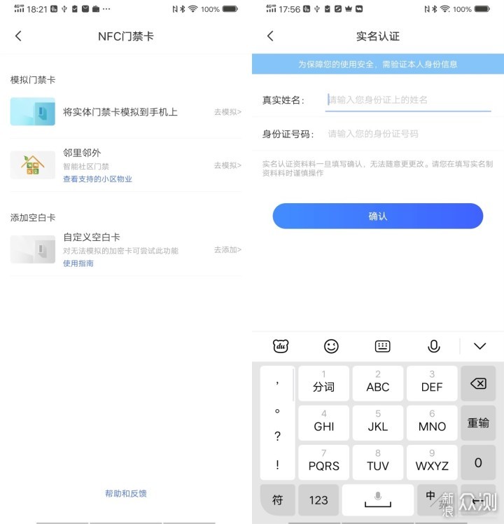 对于门禁卡的部分,在添加门禁卡前需要先进行实名认证。vivo NEX 3 5G版的NFC支持频率为13.56MHz的未加密门卡,比如大部分市面在售智能锁所制作的门禁卡,但不支持带有门禁功能的银行卡、带有储蓄消费和公交消费功能的门禁卡。另外支持部分小区物业的邻里邻外智能社区门禁。