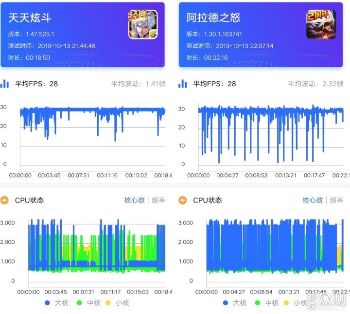 再来看看其他两款游戏的表现,一款是《天天炫斗》,一款是《阿拉德之怒》,虽然平均FPS都是28,但在平均抖动差异上有所区别,相对而言《阿拉德之怒》优化上比《天天炫斗》更差,也更吃手机性能,整个游戏过程中主要就是大核在运行,而且大部分都是满频运行,不过游戏中并不会出现卡顿的问题。