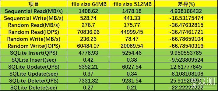 默认参数下的顺序读写性能较为出色,差异也比较大,分别达到了1400MB/s和520MB/s,随机读写性能较为接近。随着filesize的提升,顺序读取性能和SQlite相关的数据上会有提升,但顺序写入和随机读写性能上会由明显下降。