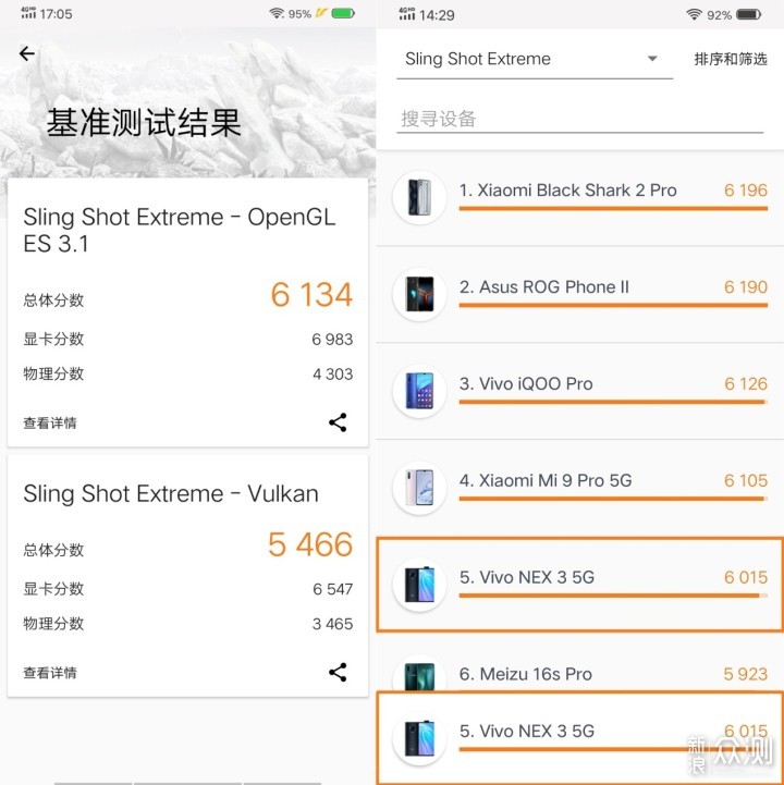 再来看看vivo NEX 3 5G版在3DMark上的测试结果,因为vivo NEX 3 5G版硬件配置高,所以这里运行的是Sling Shot Extreme,其中OpenGL ES 3.1总体分数为6134,显卡分为为6983,物理分数为4303,Vulkan总体枫树为5466,显卡分数为6547,物理分数为3465。右侧的图片是OpenGL ES 3.1总体分数下的排名,如果以实际得分6134进行对比,那么vivo NEX 3 5G版可以排到第三,高于vivo iQOO Pro和小米 Mi 9 Pro 5G,跟前两名对比的意义不大,因为这两款手机内存都是12G,而手头的这款vivo NEX 3 5G版只是8G内存。