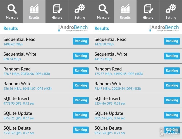 再来看看读写性能的部分,关系到日常使用中的读写速度,尤其是网络下载、游戏体验上。vivo NEX 3 5G版标配的是UFS3.0闪存,官方提到的是在智能Turbo Write和HPB技术加持下,比UFS2.1顺序读取速度提升90%,顺序写入速度更是提升了110%。这里搭配的软件是androbench5,测试选择了两组进行,一组是默认参数,另一组是直接将file size由64MB提升到了512MB,对比的意义就是看看在大体积文件写入上的性能是否明显变化。