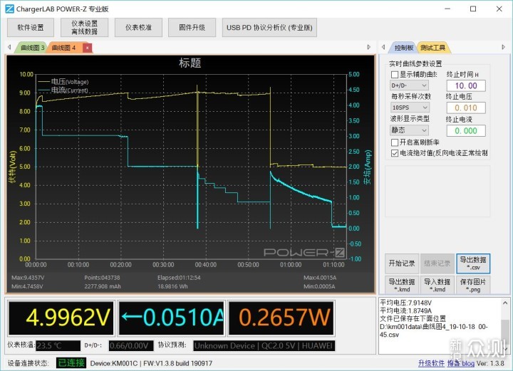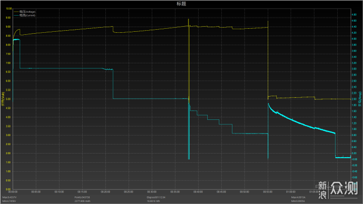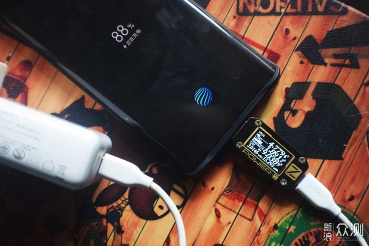 在实际的充电性能上,这里搭配的是Power-Z电流检测仪进行统计。vivo NEX 3 5G版在测试前已经经过了完整充放电三次。下面的结果是在vivo NEX 3 5G版低电量自动关机模式下所进行充电性能统计。从图像上可以看到,vivo NEX 3 5G版的充电图并非是抛物线形势,电压前期基本在9V上下,随后降至5V。初期电流能够达到4A,随后垂直降至3A、2A后进行充电,整个充电完成时间大约是72分钟,充电性能上颇为出色,而且机身并不会明显发热。