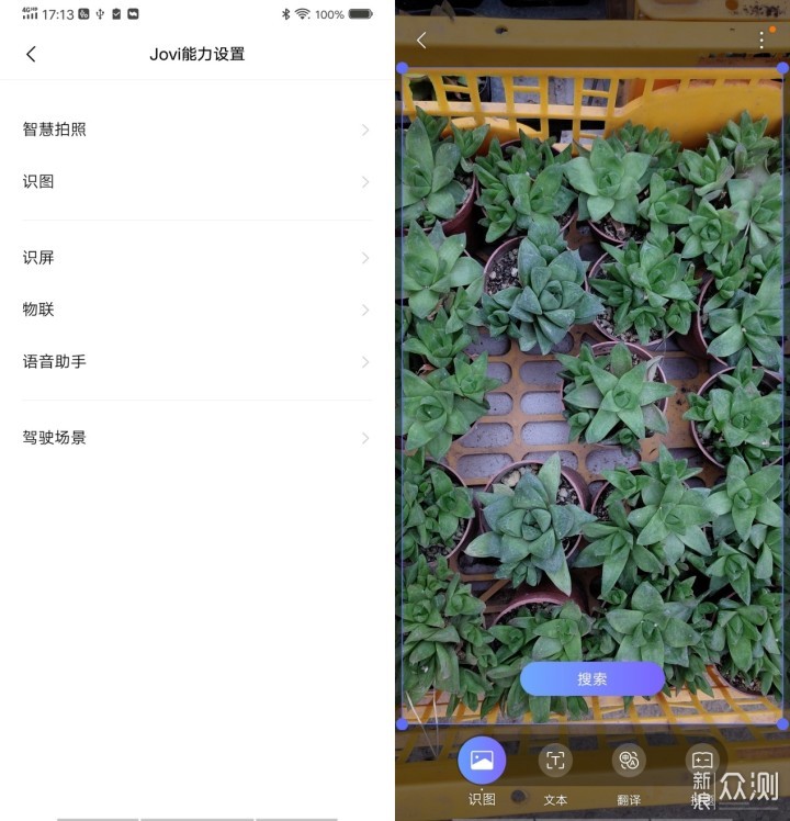 Jovi的功能远不及这些,还加入了智慧拍照、识图、识屏、驾驶场景的部分,可以用来实现翻译、扫码购物、识物、搜题解题等等,大幅提升了应用场景。