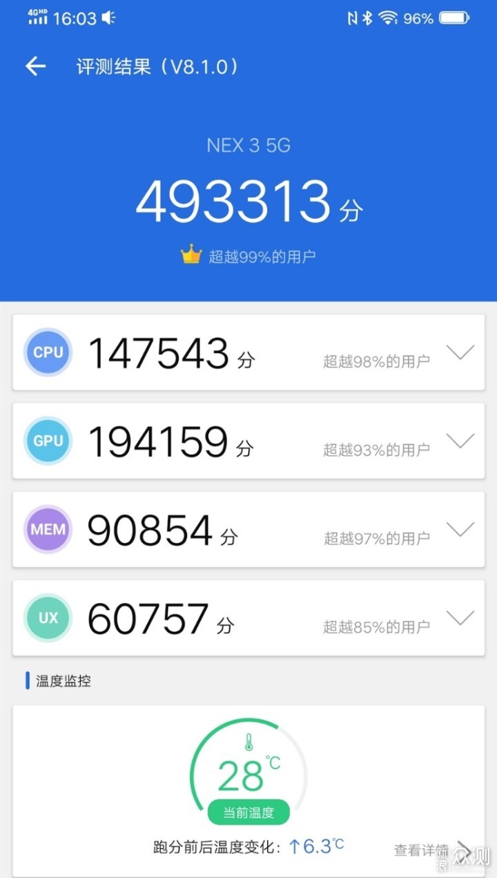 接下来再看软件性能测试部分,先附上大部分用户关注的安兔兔跑分。vivo NEX 3 5G版整体得分493313,其中CPU得分147543,GPU得分194159,MEM得分90854,UX得分60757。从49万+的综合分数情况来看,vivo NEX 3 5G版已经超越了某些电竞手机。