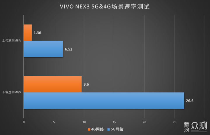 下面用两张图来进行说明,这是vivo NEX 3在搭配同一张SIM卡在同一地点分别连接5G和4G网络下的网速情况,自然是5G网络下的性能要全面占优,那么作为热点后相比于4G上网卡的表现如何呢?