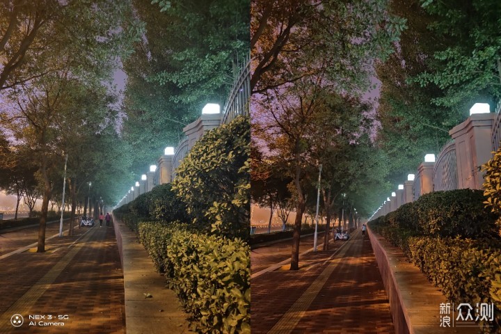 夜景或是超级夜景是目前旗舰级手机必备的一个功能,不过不同品牌手机之间的区别仍旧在于最终的成像效果。以下面这条光线黯淡的小路为例,左侧的vivo NEX 3 5G和右侧的1加7 Pro都大幅提升了画面的实际亮度,在整个画面的细节还原上也比较出色,同时对于光源亮度控制上都比较出色,但可以看到1加7 Pro在地面和墙壁上的颜色有些偏红,vivo NEX 3 5G整体的色彩表现上要更为自然真实。