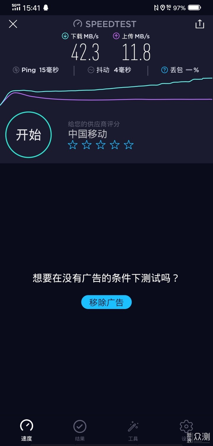 四就是不同5G覆盖区域下的网速会由于网络优化问题而存在明显差异,部分区域的表现上甚至不如4G网络。如果只是想要体验5G的最高下载速率,那么推荐你去当地对应运营商的5G体验厅,因为所体验的速度往往是最高的,比如我所在的市区只有一个中国移动5G营业厅,所测试的结果也确实是自己去过17个地点中最高的,下载和上传速率分别达到了42.3MB/s和11.8MB/s,下载性能上已经远超自己联通宽带的30MB/s。