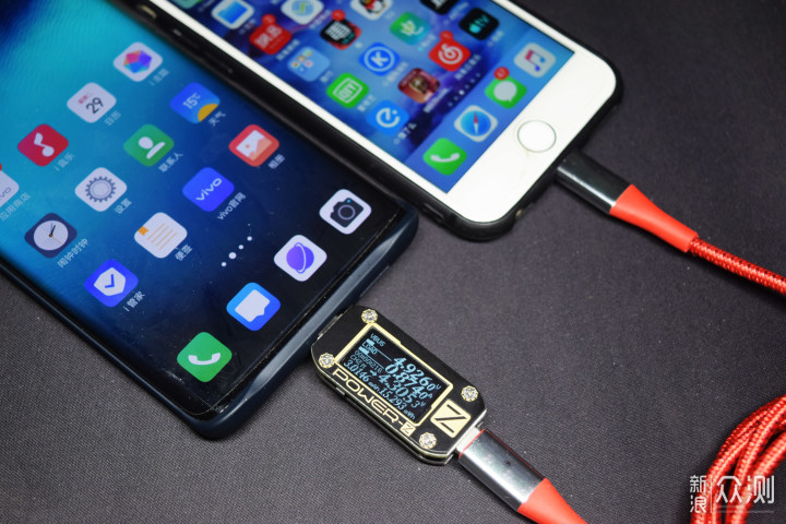 在为其他设备的充电性能上,这里以iPhone 6s和一加7 Pro进行演示说明,结果部分仅供参考。vivo NEX 3 5G版满电量情况下为iPhone 6s(33%电量)的实时充电电流为0.9A左右,波动幅度不大,电压为4.92V,实时功率为4.3W。